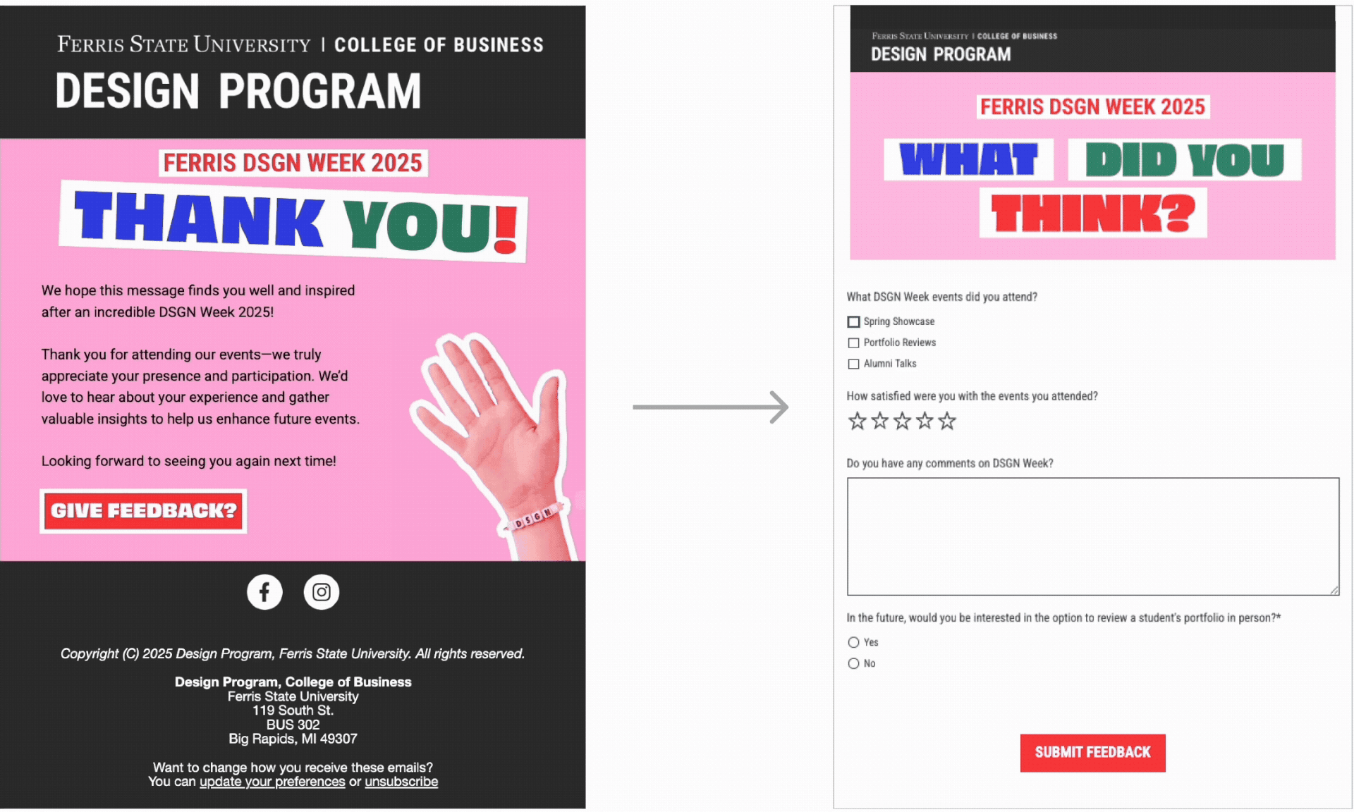 At the conclusion of DSGN Week, attendees received thank you emails linked to a feedback form and the DSGN Week website was updated with links to senior portfolios and DSGN Week photography.